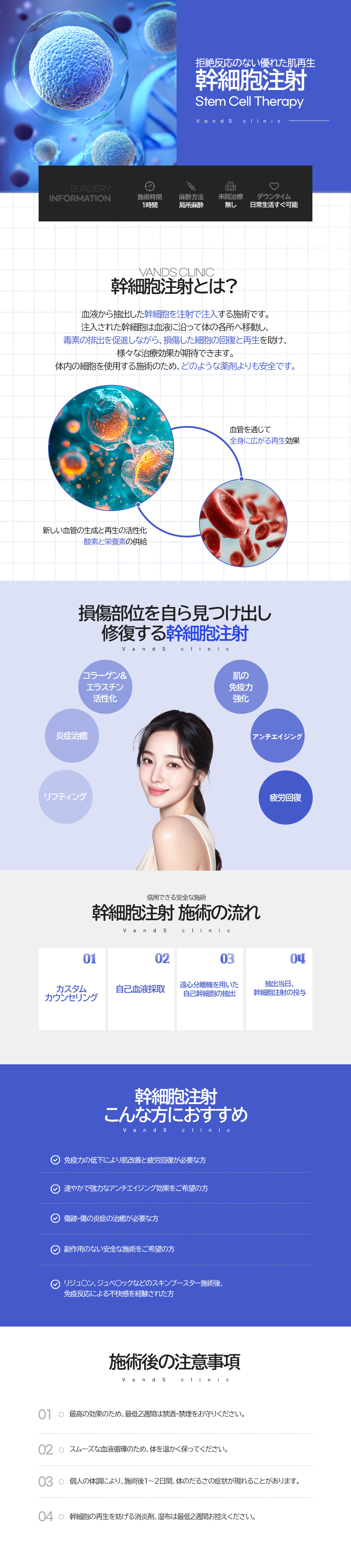 施術後、幹細胞の定着と再生を促すため、約2週間はすべてのスキンケア施術・トリートメントを中止してください。