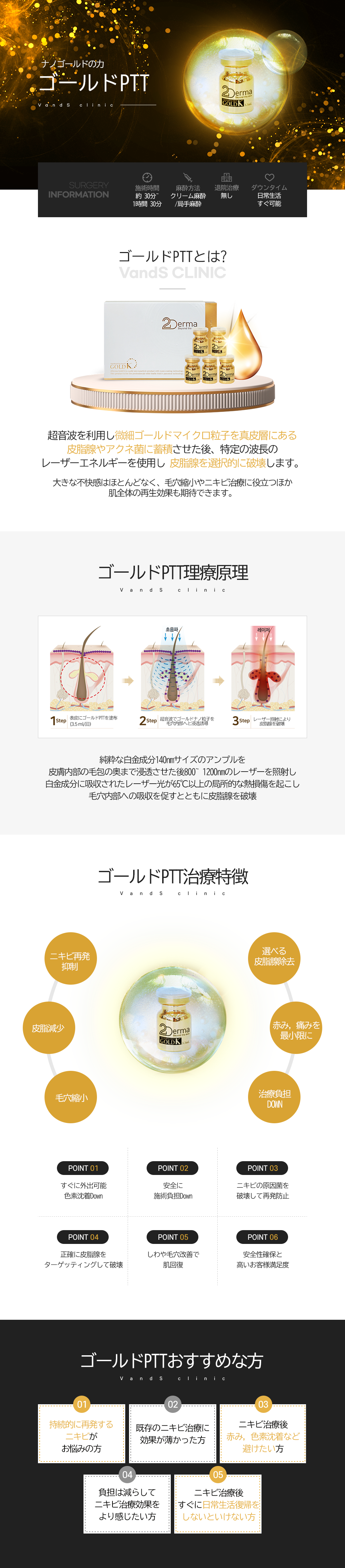 ゴールドPTTは、ゴールドマイクロ粒子を超音波で毛穴の奥まで浸透させ、その後レーザーを照射する際、皮膚全体ではなくゴールドマイクロ粒子が含まれた毛穴にのみ反応します。そのため、皮膚表面への刺激が少なく、皮脂腺に選択的に作用するという利点があります。